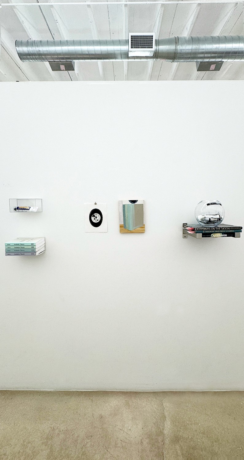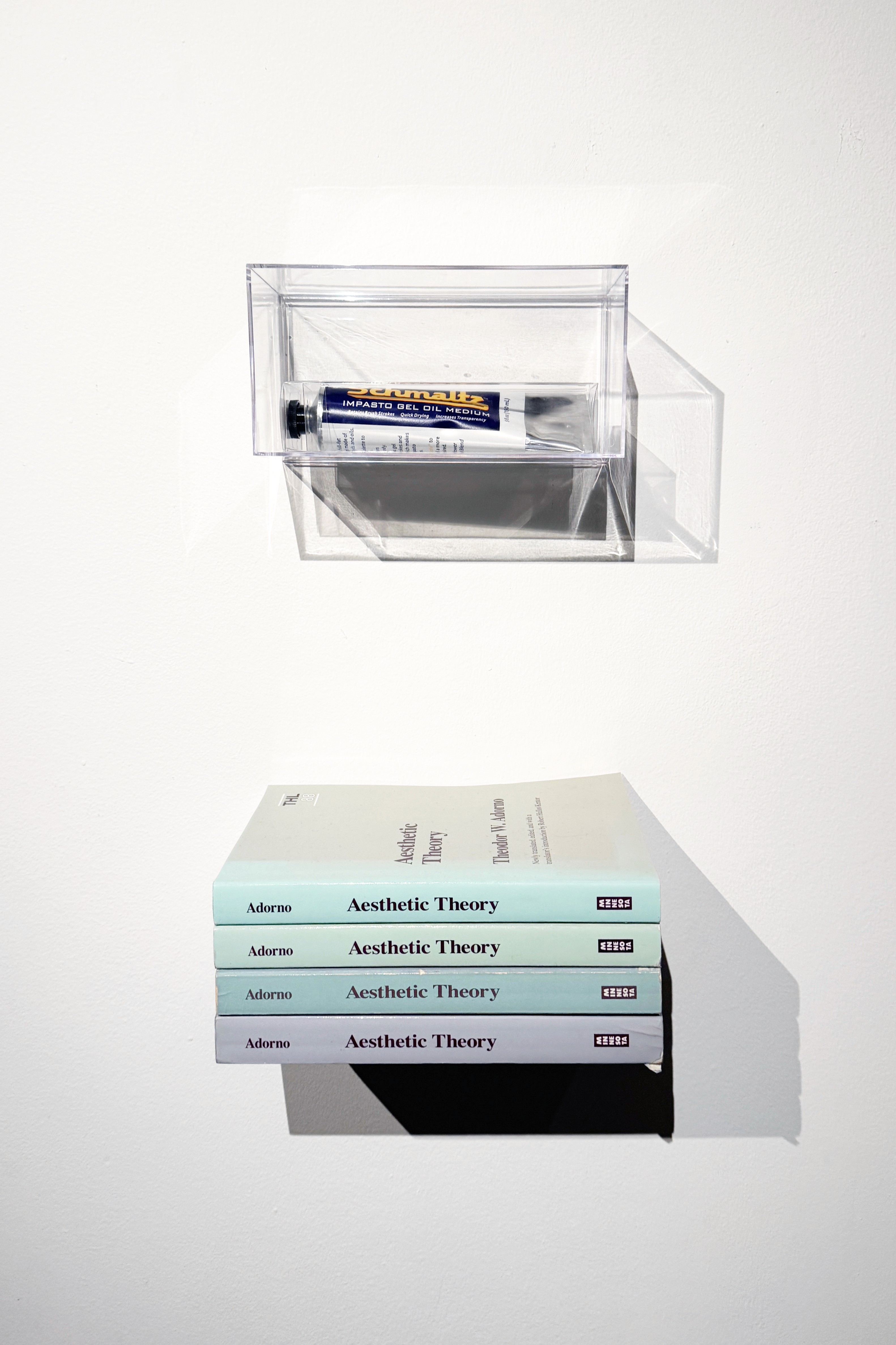 BLACKHOLE, oil on panel, collagraph print, Schmaltz Oil Painting Medium, acrylic vitrine, four copies of Theodor Adorno's aesthetic theory (three borrowed from friends).